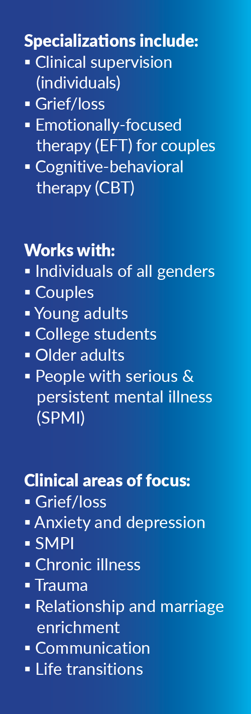 Mark works with adults with anxiety, depression, personality disorders, trauma, severe mental illness, chronic illnesses, and couples. He has a lot of experience working with people who have a family member with a severe mental illness. He has a master’s degree in social work from University of St. Thomas and St. Catherine University. Before providing therapy, he worked with adults with Severe and Persistent Mental Illness (SPMI).