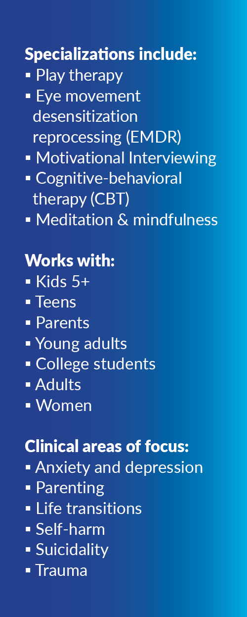 Angela believes that you are the expert in your own life, and she views her role as one who collaborates with and supports you on your journey. She uses mindfulness to provide a safe space to explore the relationship between thoughts and emotions, life’s challenges, and traumatic experiences. Angela is trained in Cognitive Behavior Therapy and Dialectical Behavior Therapy.