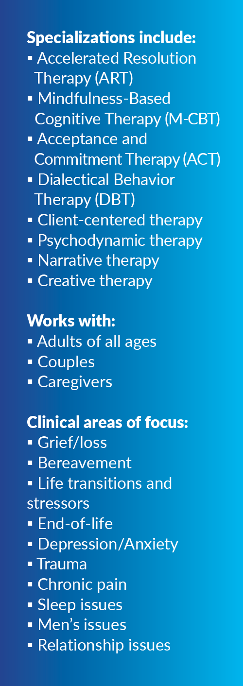Tara is a Licensed Professional Clinical Counselor (LPCC) who, since 2018, has treated a wide range of mental health concerns for adults across the lifespan. Tara has previous experience as a PEARLS (Program to Encourage Active and Rewarding Lives) Counselor providing mental health services to adults age 55+ and caregivers experiencing mild to moderate depression. She also co-facilitates caregiver support groups, provides community presentations on resilience and mental health issues, and teaches classes on caregiver support and mindfulness and meditation. She also has experience working in hospice and has been a hospice volunteer since 2017.